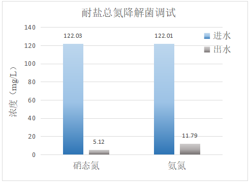 粮果废水盐度2%,30℃下经过我司耐盐总氮降解菌的生物调试后,硝态氮的去除率超过95%、氨氮的去除率超过90%。